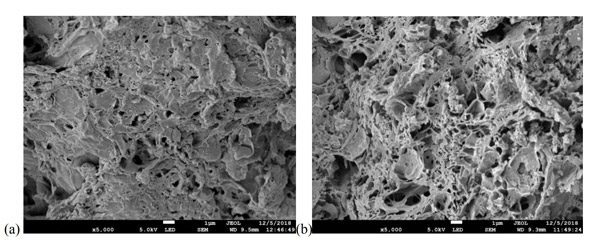 根據(jù)觀察到的活性炭微觀結(jié)構(gòu)來進(jìn)行形態(tài)研究。圖1顯示了在650°C(a)和850°C(b)兩種不同溫度下用25%H3PO4制成的活性炭的比較?梢钥闯觯c650℃相比,在850℃下制備的活性炭具有稍大的孔?梢缘弥左w積隨著活化溫度的升高而逐漸增加。