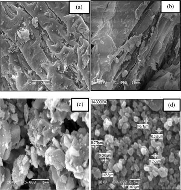 圖1:表面成像的SEM顯微照片(a)拍攝了原材料一,(b)原材料二,(c)制備的活性炭,(d)固定磁鐵礦的活性炭。