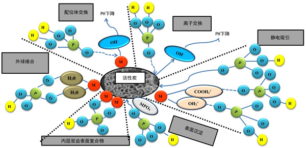 圖2:磷吸附到活性炭表面的潛在機理。
