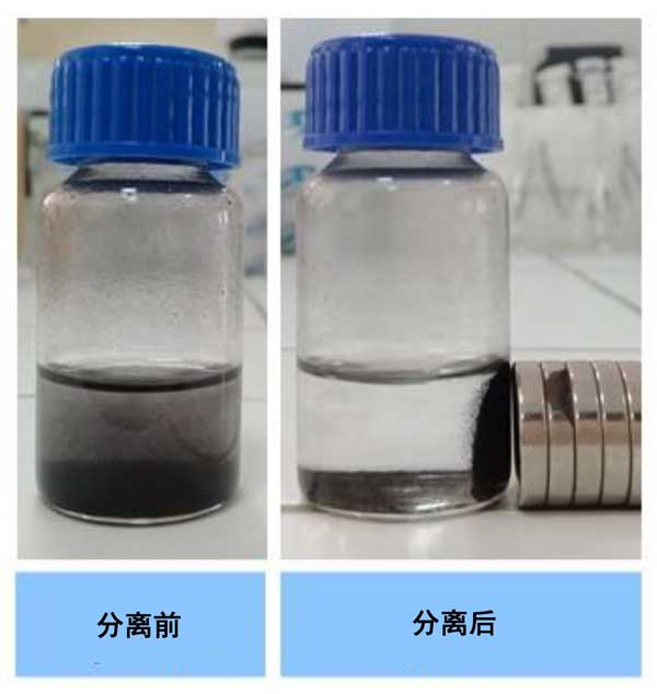圖3:Cu-Fe3O4-活性炭催化劑在外部磁場(chǎng)下的磁分離。