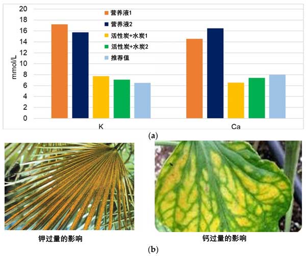 圖2:(a)通過活性炭和水炭處理將較高濃度的Ca和K降低到安全的可回收水平。(b)過量的鉀和鈣對植物生長的影響。