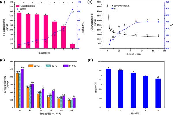 圖1:不同工業(yè)吸附劑(a)、吸附時(shí)間(b)、活性炭用量和吸附溫度(c)以及活性炭再生穩(wěn)定性(d)對(duì)玉米赤霉烯酮嚴(yán)重污染的玉米油中玉米赤霉烯酮去除的影響。