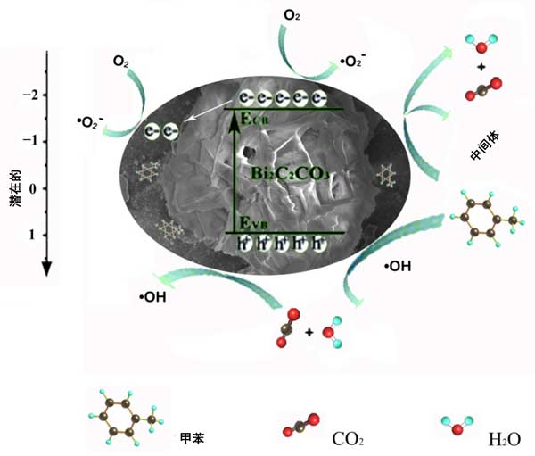 活性炭復(fù)合材料在光照射下降解氣態(tài)甲苯的光催化反應(yīng)機(jī)制可以解釋如下(圖4)。首先,蜂窩狀活性炭基質(zhì)吸附并捕獲甲苯分子。然后,在光照下,電子從價(jià)帶(VB)激發(fā)到負(fù)載Bi2O2CO3的活性炭表面的導(dǎo)帶(CB),在VB中留下空穴;钚蕴靠梢猿洚(dāng)電子受體以降低電子-空穴對(duì)的復(fù)合率。因此,Bi2O2CO3中CB上的激發(fā)電子可以很容易地轉(zhuǎn)移到活性炭表面,從而促進(jìn)光生電荷載流子的分離和遷移。