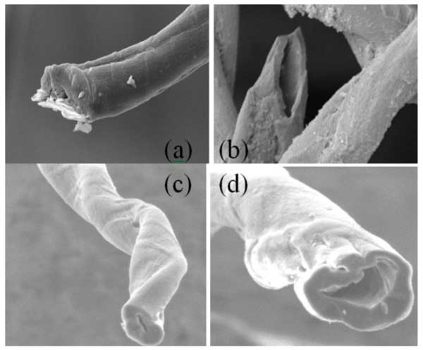 通過煅燒和HNO3、H2O2和KOH活化,廢棉纖維成功轉化為不同結構的活性炭。圖1顯示了三種活性炭的SEM圖像。可以看出,化學活化有助于大孔隙的形成。在整個纖維長度上可以觀察到一個空心芯,直徑約為0.5–5.0µM,形狀幾乎為圓形。活性炭具有高度多孔的結構,核心直徑在大約0.5和5μM之間(圖1b,d)。這種大孔隙率可能與纖維內壁木質素的化學破壞有關。參考活性炭(圖1a)呈現大孔隙,而形態特征是纖維中芯的出現,其直徑取決于活化劑。使用過氧化氫作為活化試劑獲得最大直徑(圖1b)。如圖1b-d所示,前體的結構(最初具有干凈的表面)在每次化學處理后都會被破壞。有趣的是,其中一種活性炭的表面在化學活化的影響下發生明顯變化(與其他活性炭相比)。