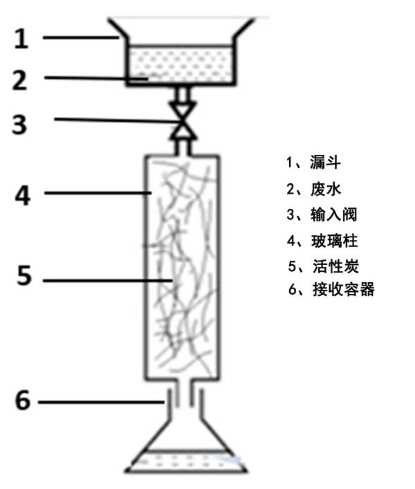 通過在密封玻璃瓶中將已知量(4.0g)的活性炭與50mL實際廢水樣品進行反應,進行批量吸附平衡實驗。測試了具有不同初始硫濃度(100、300、500、800和1000mg·L-1)的五個樣品。將瓶子在恒溫搖床上放置24小時,直至達到平衡(最終pH值:10.5)。用于床吸附實驗的裝置的示意圖如圖2所示。將碳化纖維填充到玻璃柱中以研究它們的吸附能力。廢水被引入漏斗并通過輸入閥以將流量調節為4–5.10m3·h-1。首先,使用流經柱的蒸餾水潤濕床吸附裝置以改善活性炭纖維的潤濕特性。其次,允許漏斗中的煉油廠廢水樣品內容物通過活性炭床通過重力排放到接收容器。每小時回收處理過的水。