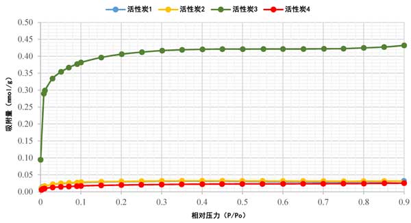 活性炭的吸附等溫線已使用氮(N2)吸附分析技術(一種標準方法)進行了研究。圖2顯示了活性炭在77K時的N2吸附等溫線,該等溫線被發現為I型等溫線。N2吸附在低相對壓力范圍內的快速上升證實了所有樣品都存在小孢子,如圖2所示。很明顯,活性炭4具有最低的N2吸附,而活性炭1和活性炭2的吸附等溫線重疊,活性炭3具有最高的N2吸附。數據的這種可變性可能歸因于所使用的不同前體材料。此外,除活性炭3外,活性炭的大部分孔隙體積都填充在P/Po≈0.1以下。對于活性炭3,孔體積填充低于P/Po≈0.3。在初始增加到0.1后,等溫線逐漸彎曲,表明進一步吸附的增量較小。隨著相對壓力的增加,所有樣品的吸附幾乎呈水平狀態,表明已經達到飽和。