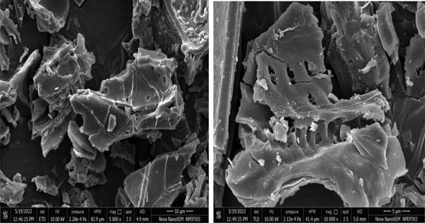 使用掃描電子顯微鏡分析獲得的活性炭的孔結(jié)構(gòu)。SEM設(shè)備具有超高分辨率低電壓成像和獨特的低真空能力。SEM圖像是在15kV時以1nm、1kV時1.4nm、3kV時1.8nm和30Pa的不同分辨率拍攝的。觀察活性炭的表面物理形態(tài)是通過使用SEM完成的技術(shù)。圖3顯示活性炭的SEM圖像。這表明活性炭的外表面具有均勻開放的大孔。此外,活性炭的表面是高度多孔的,其特點是不均勻。同樣清楚的是,活性炭在其外表面具有微孔和空腔,暗區(qū)位于該處。經(jīng)受碳化后,活性炭由于ZnCl2的蒸發(fā)而產(chǎn)生空隙(稱為氣孔)。可以將這些孔視為通向微孔網(wǎng)絡(luò)的通道。