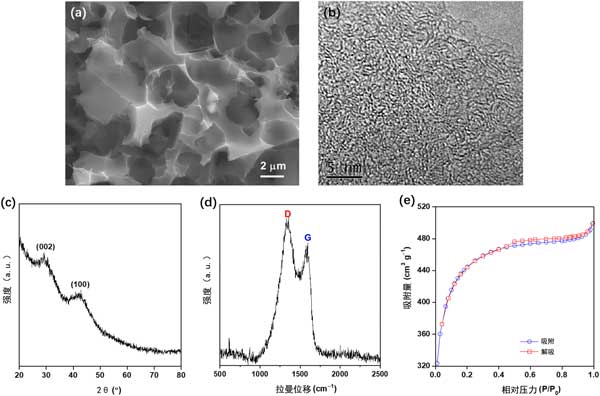 圖1:所制備活性炭的表征結果:(a)FE-SEM和(b)高分辨率TEM圖像、(c)XRD圖、(d)拉曼光譜和(e)N2吸附/脫附等溫線。
