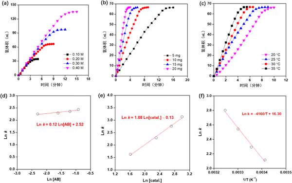 圖2:在不同的(a)氨硼烷濃度、(b)催化劑量和(c)反應溫度下,Co0.8Cu0.2P/活性炭催化氨硼烷水解產生的氫氣體積與反應時間的關系圖。(d和e)氫氣產生率(k)分別與氨硼烷濃度和催化劑濃度的對數圖。(f)lnk與1/T的Arrhenius圖 。