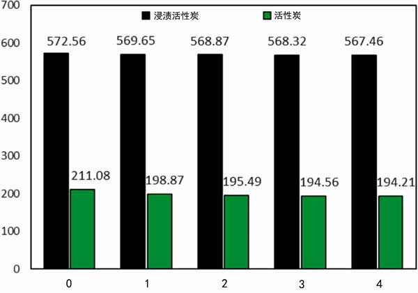 為了研究吸附劑吸收汽油蒸汽的性能,我們進一步評估了樣品在吸附-解吸循環中的可重復使用性。在恒溫下,1小時后,當吸附劑達到飽和狀態時,浸漬再生過程。四個吸附循環后,蒸汽吸附容量為567mg/g,所用吸附劑保持大量吸收分子。HMTA-AC-D樣品表明蒸汽吸收略有減少約0.89%,而活性炭樣品的這一量為7.9%(圖3)。在高循環下,由于孔隙的逐漸破壞和不完全脫氣,吸收量可能會顯著降低。根據我們的發現,與文獻相比,制成的吸附劑在物理和熱學上表現出更高的穩定性。這些結果表明,樣品在回收汽油蒸汽時具有很高的可持續性,可以作為一種有效的吸附劑提出并考慮。
