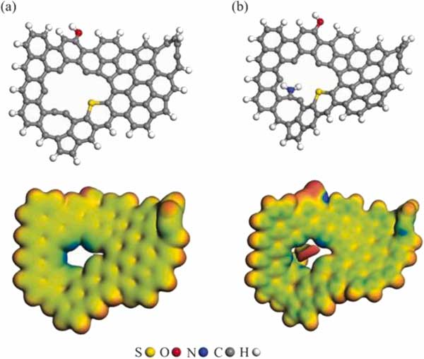 圖4:(a)活性炭和(b)浸漬活性炭吸附劑的優化幾何結構(上圖)和相應的MEP等值面。