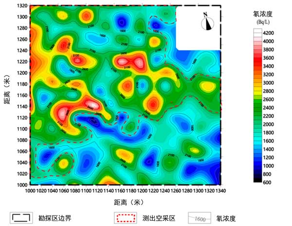 圖2:活性炭測量的氡值等高線平面和采空區(qū)異常解釋(紅色線框)圖。