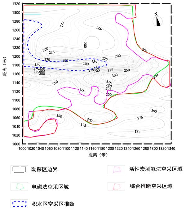 電磁法集探測深度大、分辨率高、能夠識別采空區(qū)積水狀態(tài)等優(yōu)點于一體。但是,它很容易受到靜電效應和近場效應的影響。發(fā)射端附近的導體可能會對發(fā)射源產生干擾,在地形地貌、工作環(huán)境復雜的地區(qū)極易影響測量精度。然而,用于氡測量的活性炭方法不受地形、地電或EMF的影響。然而,這種方法無法解釋采空區(qū)深度。因此,這兩種方法可以相互借鑒,彌補各自的不足。
