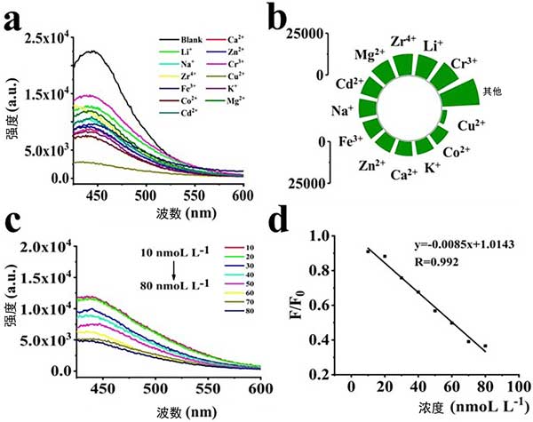 納米活性炭點(diǎn)對(duì)金屬離子的選擇性至關(guān)重要,添加納米活性炭點(diǎn)后檢查金屬離子的熒光強(qiáng)度。當(dāng)將納米活性炭點(diǎn)添加到空白溶液和含有12種金屬離子的溶液中時(shí),發(fā)生熒光發(fā)射,如圖2a和b所示。然而,當(dāng)添加Cu2+時(shí),納米活性炭點(diǎn)的熒光強(qiáng)度明顯下降,熒光強(qiáng)度下降了87.1%,表明發(fā)生了明顯的熒光猝滅。隨著Cu2+濃度從10nM增加到80nM,納米活性炭點(diǎn)的熒光強(qiáng)度隨著Cu2+濃度的增加而降低,如圖2c所示。線性相關(guān)系數(shù)(r)為0.992(圖2d)。檢測(cè)限(LOD)計(jì)算為3r/S,其中r代表空白信號(hào)標(biāo)準(zhǔn)偏差(n=11),n指對(duì)空白樣品進(jìn)行重復(fù)測(cè)量的次數(shù),S(指斜率)的線性曲線)。因此,Cu2+的納米活性炭點(diǎn)的LOD計(jì)算為2.83nmol/L-1。一些報(bào)道的材料可以同時(shí)檢測(cè)兩種或多種金屬離子。例如,摻雜氮和硫制備的基于羊毛角蛋白的熒光CQD可以檢測(cè)Cr6+和Fe3+。相比之下,鴿糞合成的氮硫共摻雜熒光納米活性炭點(diǎn)可以檢測(cè)Hg2+和Fe3+。在我們的案例中,納米活性炭點(diǎn)對(duì)Cu2+的檢測(cè)表現(xiàn)出高選擇性。納米活性炭點(diǎn)的表面有機(jī)基團(tuán)(-COOH和-NH2)具有很強(qiáng)的選擇性與Cu2+結(jié)合的能力,導(dǎo)致納米活性炭點(diǎn)聚集,產(chǎn)生較高的猝滅熒光強(qiáng)度,從而導(dǎo)致納米活性炭點(diǎn)的熒光強(qiáng)度猝滅。當(dāng)Cu2+濃度在10至80nM范圍內(nèi)時(shí),熒光強(qiáng)度表現(xiàn)出良好的線性相關(guān)性,如圖2d所示。