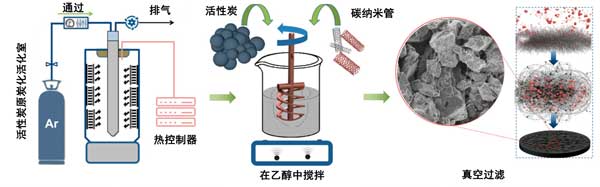 圖1:使用活性炭與碳納米管(不含聚合物粘合劑)制備電極的示意圖。