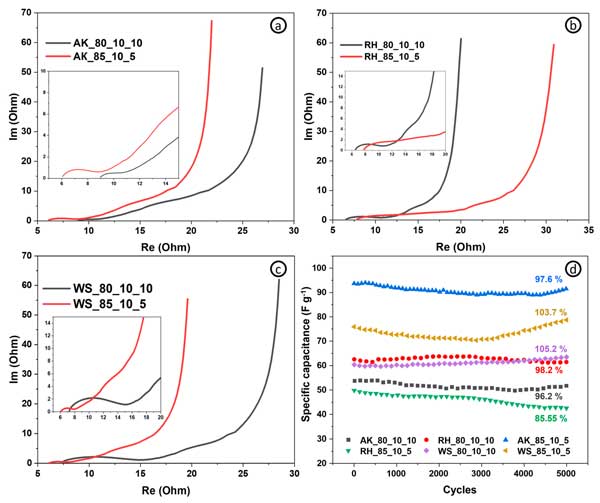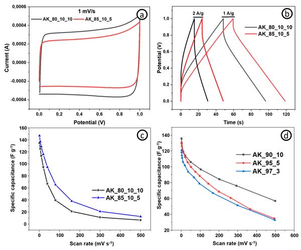 活性炭電極表現出比常規樣品更好的比電容和能量密度(相同功率密度下的最大能量密度為4.8vs.4.4Wh/kg-1),因為有更多的活性材料,而電阻、倍率能力(圖3c)和功率密度—這取決于電極的導電能力(基于導電添加劑含量)。圖3d顯示了具有不同活性炭和碳納米管含量的電極在不同掃描速率下的比電容。碳納米管含量為10%的電極在1mV/s-1下實現了137F/g-1的最高比電容。從圖中可以清楚地看出,就比電容而言,活性炭和碳納米管的最佳比例為90:10。綜上所述,我們可以得出這樣的結論:對于超級電容器的自支撐電極,活性成分、結合成分和導電成分的最佳比例為85:10:5。可以進一步評估具有這種含有源自其他生物前體的活性材料的組合物的電極的電化學性能。
