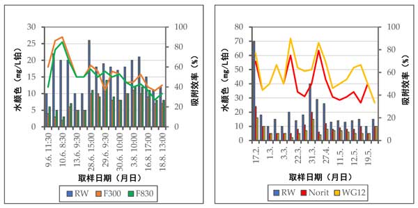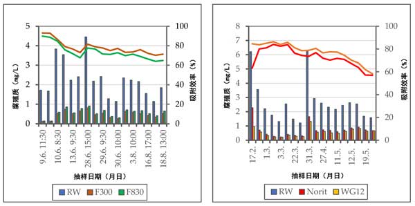 圖2:原水中和處理后的水中腐殖質的濃度以及吸附材料的效率。