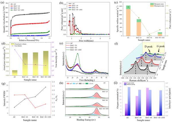 圖2:球磨活性炭的結構表征。(a)N2吸附-脫附等溫線;(b)孔徑分布;(c)比表面積和孔體積;(d)閉孔體積和真密度;(e)XRD圖譜;(f)拉曼光譜;(g)樣品拉曼光譜的XRD(002)峰強度的變化;(h)XPSC1s譜;(i)氧含量和層間距。