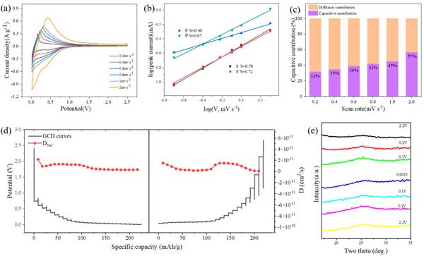 圖4:(a)活性炭從0.2到2mVs-1的CV曲線。(b)峰值電流與確定b值時的掃描速率之間的關系。(c)不同掃描速率下電容和擴散主導容量的百分比貢獻。(d)活性炭電極的GITT測試結果。(e)活性炭電極在鈉化和脫鈉各個階段的異位XRD譜。