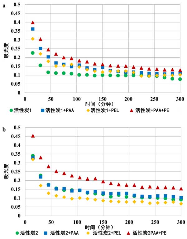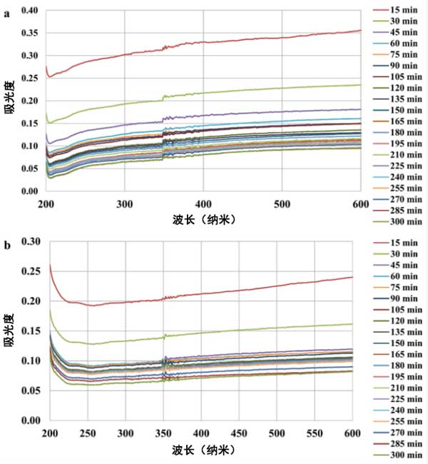 圖3:活性炭1(a)和活性炭2(b)活性炭懸浮液在不同波長下的吸光度。
