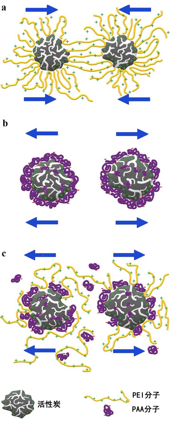 圖6:PEI的主要穩定/去穩定機制-橋聯絮凝(a)、PAA-靜電空間穩定(b)和二元系統-靜電和耗盡穩定相結合(c)。