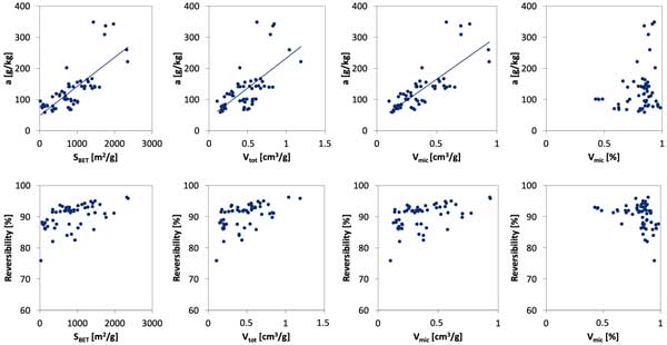 圖1:氨吸附能力和可逆性與原材料、炭和制備的活性炭的多孔結構參數的相關性。